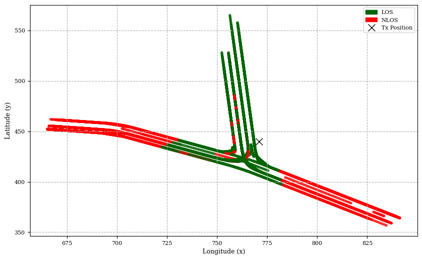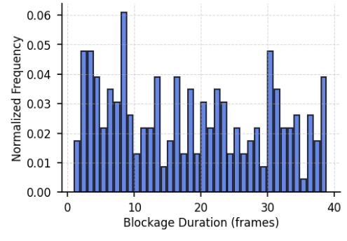 Scenario 15 is a synthetic street-level urban canyon scenario with mobile vehicles, ray-traced channels, LIDAR, RGB cameras, GPS and full MIMO channel matrices at 60 GHz. In this scenario, the base station antenna is positioned at 10m height from the surface located at the corner end of the main street, making the link more susceptible to dynamic blockages (e.g., buses and trucks) and cornering effects. The NLOS rate is approximately 50% while the LOS↔NLOS transition rate is about 1% of the scenes. Rosslyn urban scenario is configured in 60GHz, with 145 episodes of 40 scenes each, 5 mobile receivers and 1 fixed transmitter.