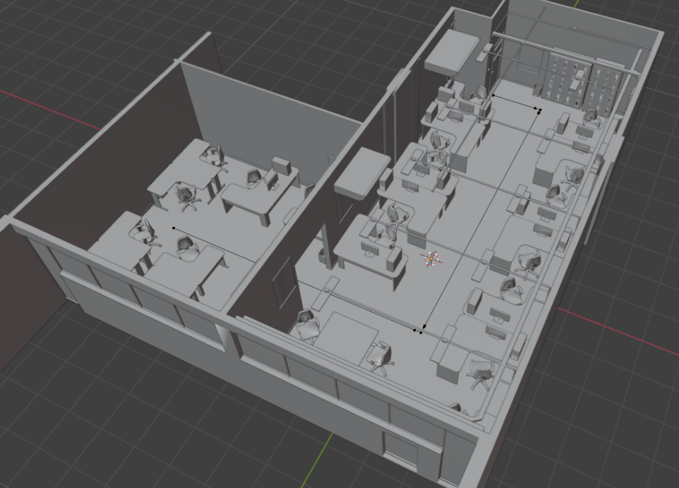 From a wireless-channel perspective, the environment behaves as an indoor canyon: walls, partitions, and large furniture create strong multipath through reflections and diffractions, while corners and obstructions induce transitions between NLOS and LOS conditions along the trajectories. In this scenario, one receiver is configured to predominantly experience LOS-like propagation over the route, whereas the other is designed to undergo more NLOS segments, with both converging to an LOS condition near the end of the paths. This combination of realistic geometry, dense object placement, and controlled pedestrian mobility makes the scenario representative for evaluating indoor beam management tasks such as beam tracking, blockage events, and robustness to rapid LOS/NLOS transitions.