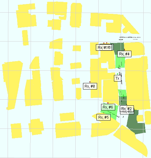 Scenario 3 is a synthetic street-level urban canyon scenario with mobile vehicles, ray-traced channels at 2.8; 60 GHz (2 versions). In this scenario, the base station antenna is positioned at 4m height from the surface making the link more vulnerable to dynamic blockages (buses, trucks) and cornering. Rosslyn urban scenario is configured in 2.8; 60GHz (2 versions), with 1800 episodes of 1 scenes each, time between scenes of 1s, time between episodes of 3s, 10 fixed receivers and 1 fixed transmitter. The images 1-3 show the 3D meshes of scenario in blender, the SUMO view of maped street where the vehicles realize their routs, the top view of scenario (constructions in yellow, sparce foliage in light green, dense foliage in dark green, ground in baby blue, receivers in red, transmitter in green) at Wireless Insite, respectively.