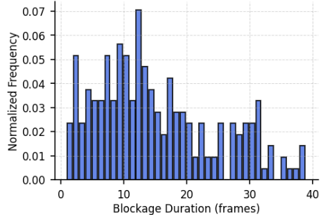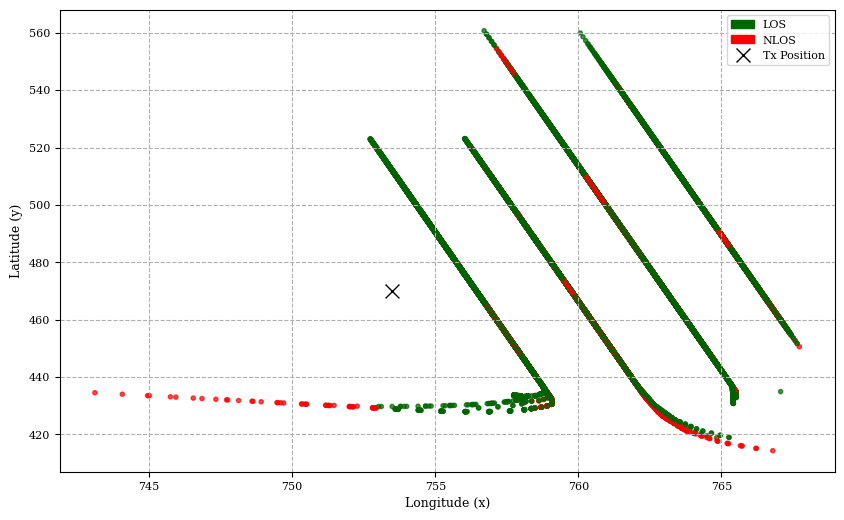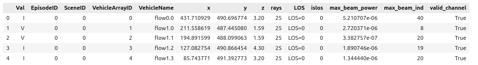 Scenario 9 is a synthetic street-level urban canyon scenario with mobile vehicles, ray-traced channels, GPS and full MIMO channel matrices at 60 GHz. In this scenario, the base station antenna is positioned at 5m height from the surface making the link more vulnerable to dynamic blockages (buses, trucks) and cornering. The transition rate (LOS<>NLOS) is about 4.5% of the scenes stressing both prediction and scheduling. Rosslyn urban scenario is configured in 60GHz, with 76 episodes of 20 scenes each, 10 mobile receivers and 1 fixed transmitter.